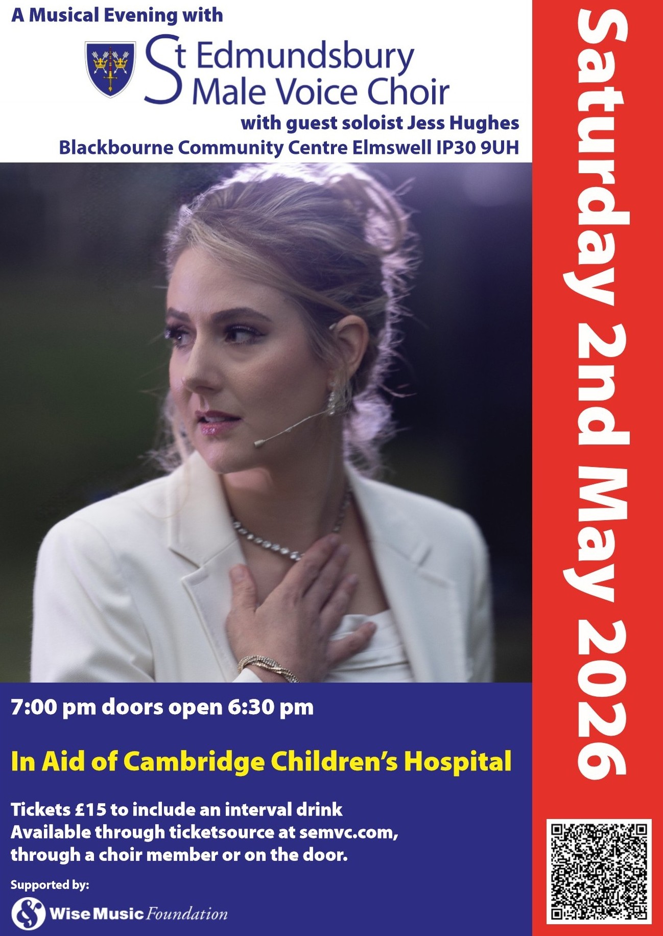 Saturday 2 May Concert at The Blackbourne Centre, Elmswell. 7pm. Jess Hughes soloist Details to follow.